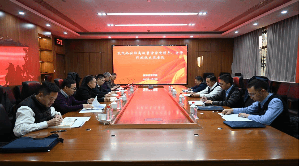 2025年11月25日下午,公安部高级警官学院(以下简称公安部高警院)党委委员、副院长杨英明带领该院3位同志来到国际关系学院,就优化国家安全教培工作体系、提升相关工作能力,与国家安全教育学院进行调研座谈。双方围绕培训课程和师资队伍建设、智库研究、教培信息化和培训质量监控体系建设等内容展开深入交流和探讨。院党委专职副书记、纪委书记崔国贤和副院长贾敬参加了本次座谈会。座谈会由贾敬副院长主持。