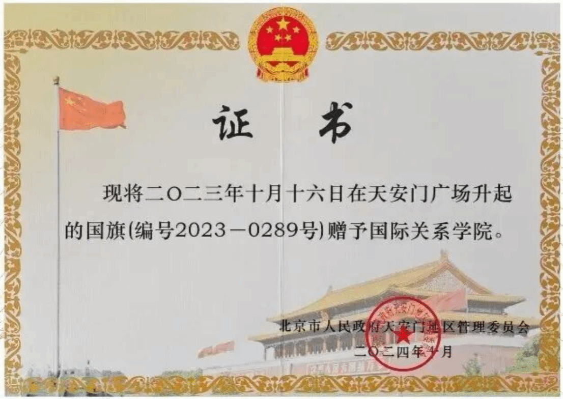 2024年10月12日,国旗赠予交接仪式在天安门地区管理委员会举行。天安门地区管理委员会党组成员、副主任姚辉向我院党委专职副书记、纪委书记崔国贤庄重赠予国旗并进行了交接。