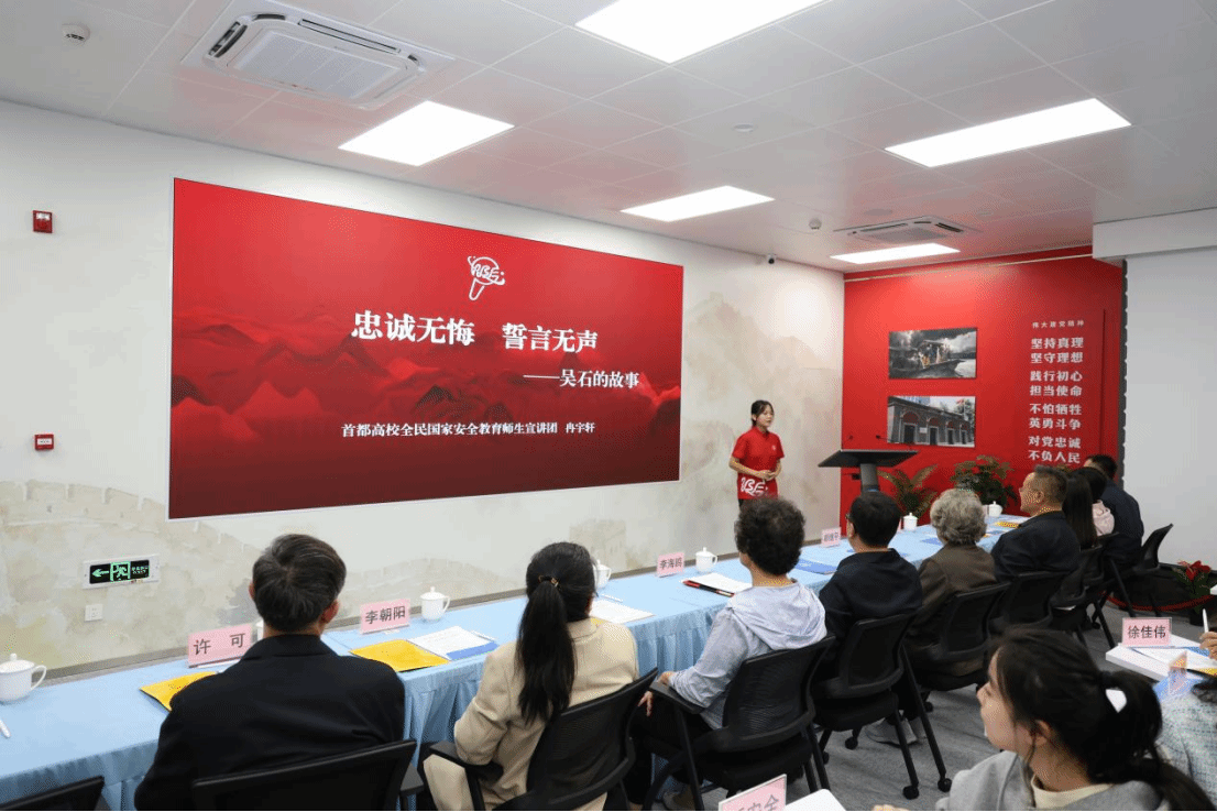 “忠诚教育室”正中央展柜中陈列着学院建校75周年之际请领的在天安门广场上升起的国旗。首都团学生宣讲员潘宇哲以《弘扬爱国主义精神 凝聚磅礴人民力量》为题作国旗教育主题宣讲,从国旗诞生背后的故事讲起,深入阐释解读国旗精神,并通过国旗串联起76年来党领导人民自力更生、接续奋斗取得的彪炳史册的辉煌成就,铺展了一幅以中国式现代化推进强国建设、民族复兴伟业的忠诚画卷。