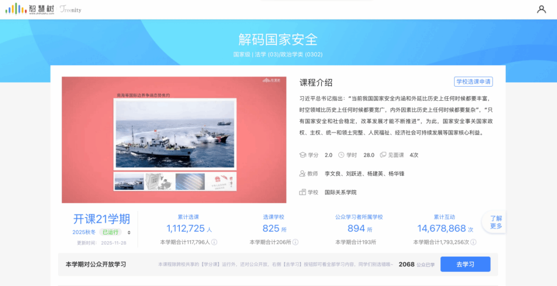 国际关系学院的国家级精品课《解码国家安全》已连续开课21学期,选课人数逾百万。