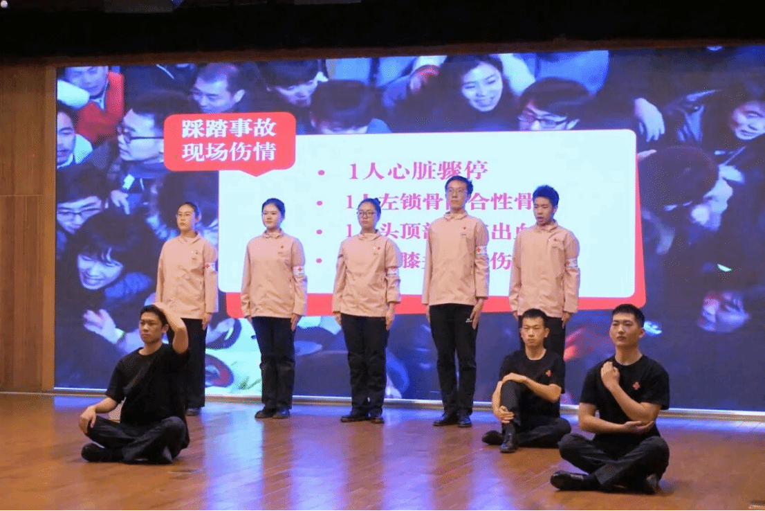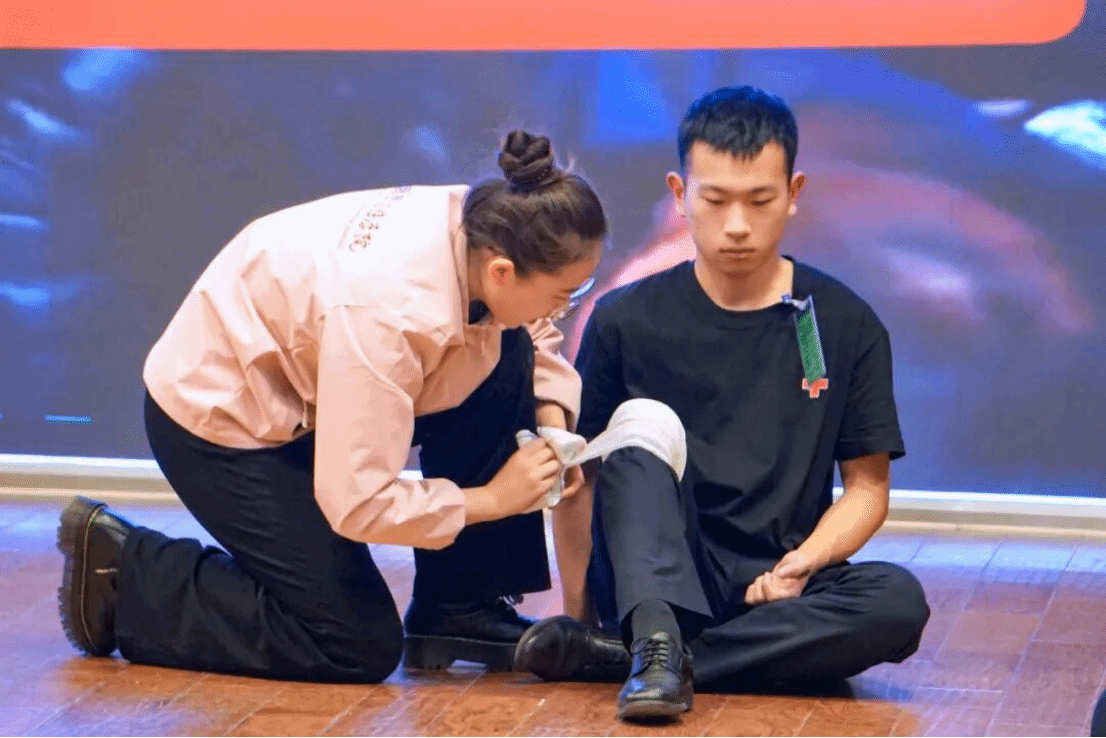 在应急救护技能交流展示环节中,我校参赛队伍作为1号选手率先登场。比赛模拟踩踏事故现场,伤员情况复杂,一人心脏骤停,一人左锁骨闭合性骨折,一人头顶部外伤出血,一人右膝关节擦伤。急救用品清点到位后,我校参赛队伍迅速响应,现场秩序井然。