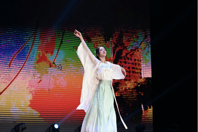 紧接着是心理学院的舞蹈表演。舞者以水袖为笔,蘸取黄昏细雨,勾勒出“绿肥红瘦”的庭院深深。轻愁、醉影,每一个旋转都是对易安词魂的隔空对话,在如梦的舞姿中完成对宋词美学的全新诠释。