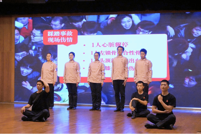 在应急救护技能交流展示环节中,我校参赛队伍作为1号选手率先登场。比赛模拟踩踏事故现场,伤员情况复杂,一人心脏骤停,一人左锁骨闭合性骨折,一人头顶部外伤出血,一人右膝关节擦伤。急救用品清点到位后,我校参赛队伍迅速响应,现场秩序井然。