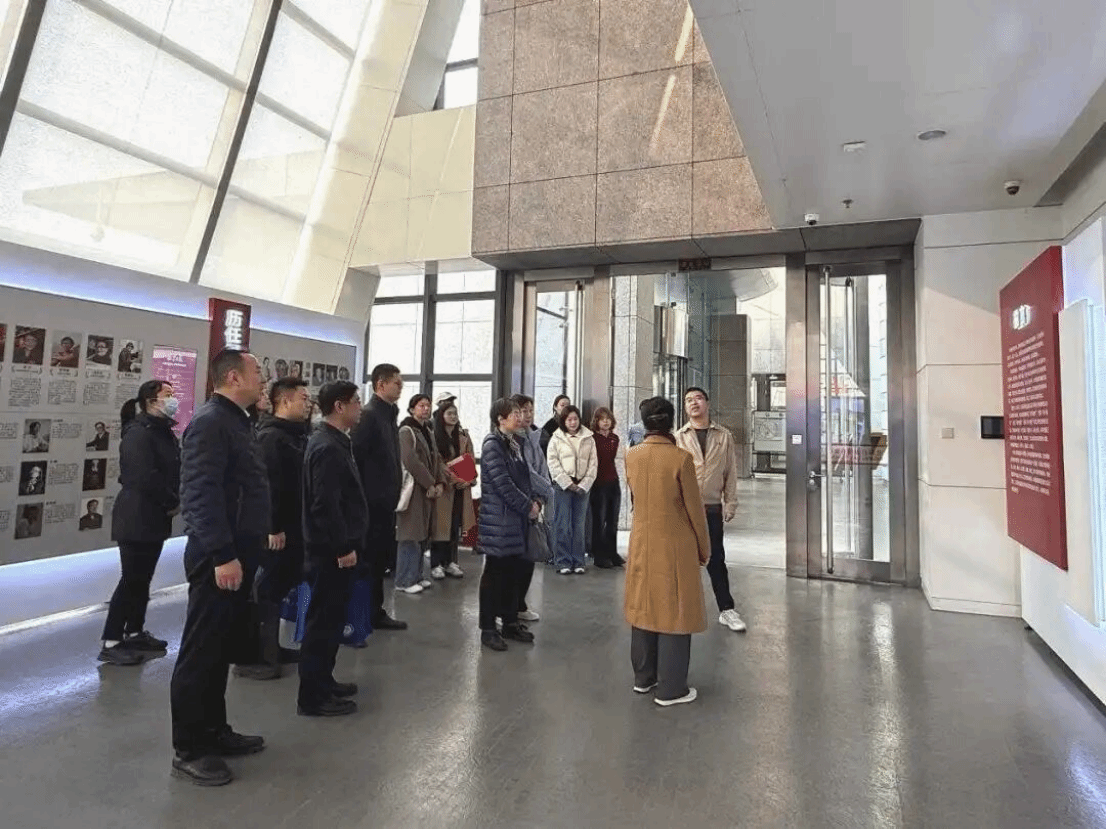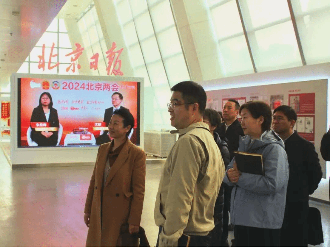 活动伊始,我校师生党员首先参观《北京日报》社史展,北京日报社国际传播部李海青主任亲自引导并讲解。师生党员认真观看展览,展览通过“背景板+实体报纸”编年体形式展出,参观者走进历史,见证荣光,共期未来。丰富的史料与生动的讲解,使同学们对主流媒体的历史沿革、社会责任与国际传播实践有了更为直观和深刻的认识。