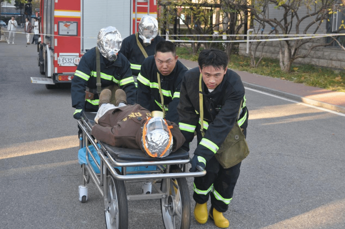 演练中还模拟了四楼发生火情、有学生受困的情景。颐和园消防站消防员和我院消防微站队员迅速登楼成功救出受困同学,并将其转移至安全区域交由医护人员进行后续救治。