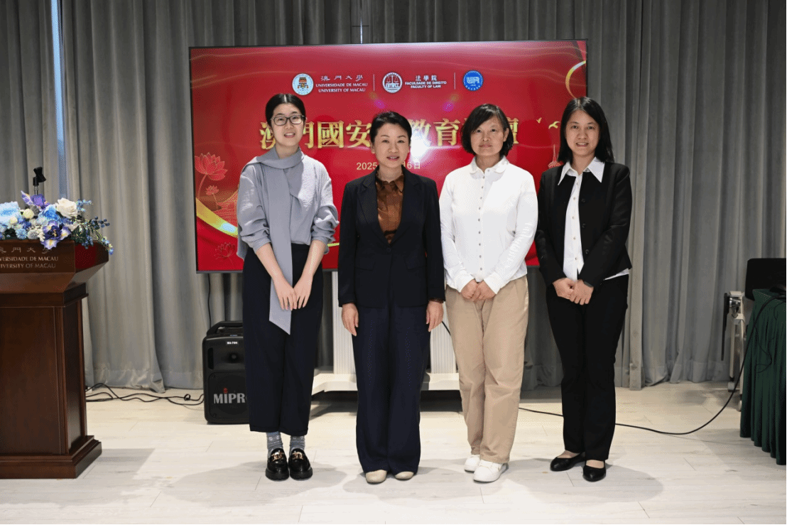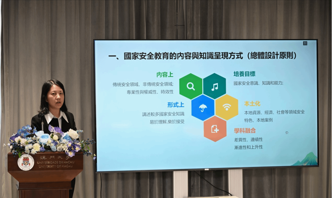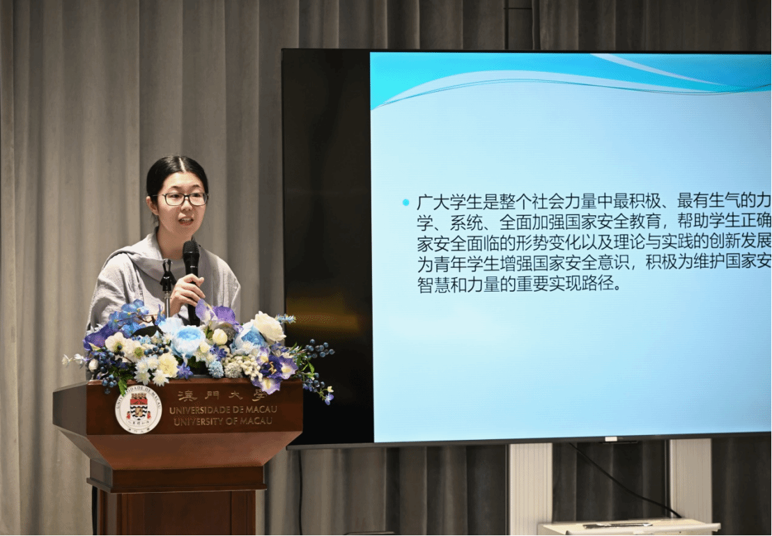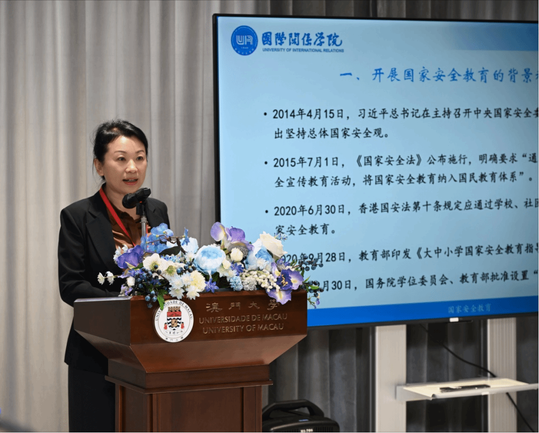 签约仪式后,《国家安全教育》系列教材编写团队参加了由澳门大学法学院和国际关系学院国家安全法治研究基地联合举办的“澳门国安法教育论坛”。论坛作为澳门首次举办的国家安全教育主题论坛,邀请了来自澳门特区政府教育及青年发展局、澳门特区政府司法警察局、澳门保安部队高等学校、香港教育大学、香港城市大学、深圳大学、中山大学、上海国际问题研究院等部门及高校、研究机构的50余位领导和专家学者参会。签约仪式前播放了国际关系学院75周年校庆宣传片。我院毕雁英、杨卡、齐琳、丑则静分别在论坛发言,并与参会专家学者展开充分的交流研讨,共商澳门国家安全教育现状、存在的问题及未来发展。