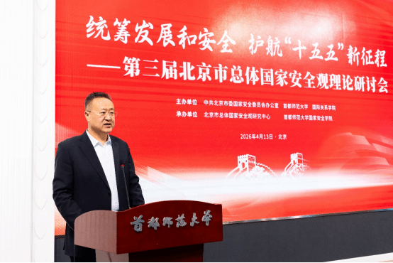 4月13日,在第11个全民国家安全教育日来临之际,由中共北京市委国家安全委员会办公室、首都师范大学、国际关系学院联合主办的“统筹发展和安全 护航‘十五五 ’新征程——第三届北京市总体国家安全观理论研讨会”在首都师范大学举行。北京市委副秘书长、市人大社会建设委员会主任委员刘志伟,教育部思想政治工作司副司长庞谦、首都师范大学党委书记曹文军,国际关系学院党委副书记、院长胡继平和中央有关部门、北京市委有关部门领导出席会议。