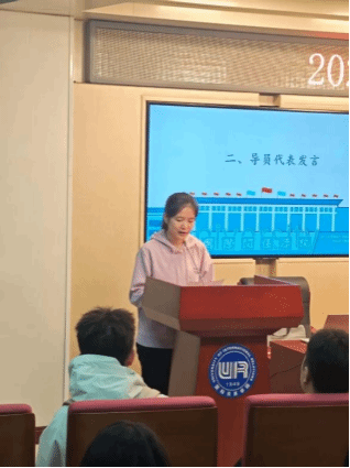 外语学院23级杨若兮同学作为导员代表发言。她结合自己辅导工作经历进行经验分享,朋辈辅导并非单向知识输出,而是双向促进的过程——导员在备课梳理知识点时可查漏补缺、巩固自身知识体系,在调整讲解节奏、优化沟通方式的过程中能提升表达与沟通能力,更能在与学员共同解决问题的过程中收获真挚友谊。