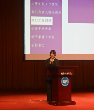 第三十三届综合事务部负责人林凯欣表示,在上一阶段工作中,综合事务部各成员合理分工、默契配合,高效高质的举办了各项活动。她从校内和校外两个方面进行了工作回顾与总结,并就未来工作方向提出明确展望,强调必须始终坚守为同学们服务的根本宗旨,切实维护同学们各项权益,持续加强思政引领,助推青年学生精神建设工作,同时积极拓展外联业务,以全面提升部门工作的协调性与完善性,确保部门工作始终沿着正确方向稳步推进。最后,对老干事表达了诚挚的谢意,并对新干事致以热烈欢迎,希望干事们能在部门中收获归属感与成就感。
