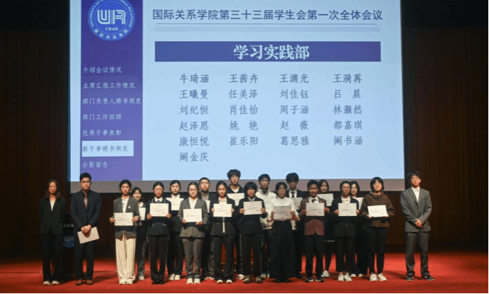 2025年10月15日下午4时,国际关系学院第三十三届学生会聘任大会暨优秀干事表彰大会在学术交流中心礼堂顺利举行。本次大会由综合事务部沈晓彤主持,第三十三届学生会全体成员齐聚一堂,既是对过往工作的总结复盘,也是对新征程的启航部署,更以表彰先进树立榜样,凝聚起服务同学的青春力量。