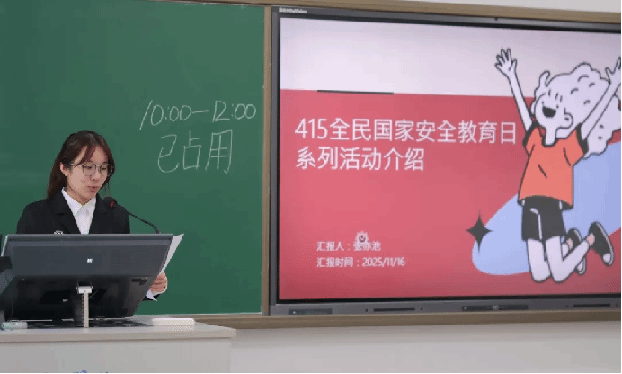 综合事务部负责人张亦池同学详细介绍了“4·15”全民国家安全教育日系列活动:从在“识影寻安”环节中学习20个国家安全重点领域标识,到“迷途破译”拼图互动中的沉浸体验,再到“街头问答”搭建的公众交流桥梁,系统展示了我校学子筑牢安全防线的思考与实践。