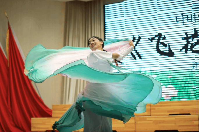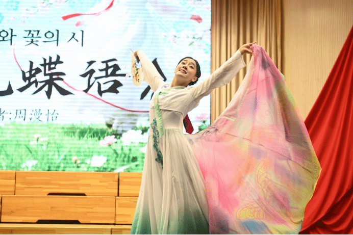 纸扇轻摇,蝶影纷飞,周漫怡同学用舒展的舞姿与轻盈的舞步为我们带来了一场灵动的视觉盛宴。当春风拂过长白山麓,当蝶翼轻吻溪畔繁花,朝鲜舞《飞花蝶语》在悠扬的乐声中翩然而至。裙摆随着转动如流云般舒展,当我们的目光延伸至比舞者的指尖更远的地方,将会与一切的灵动和温婉悠然相逢。