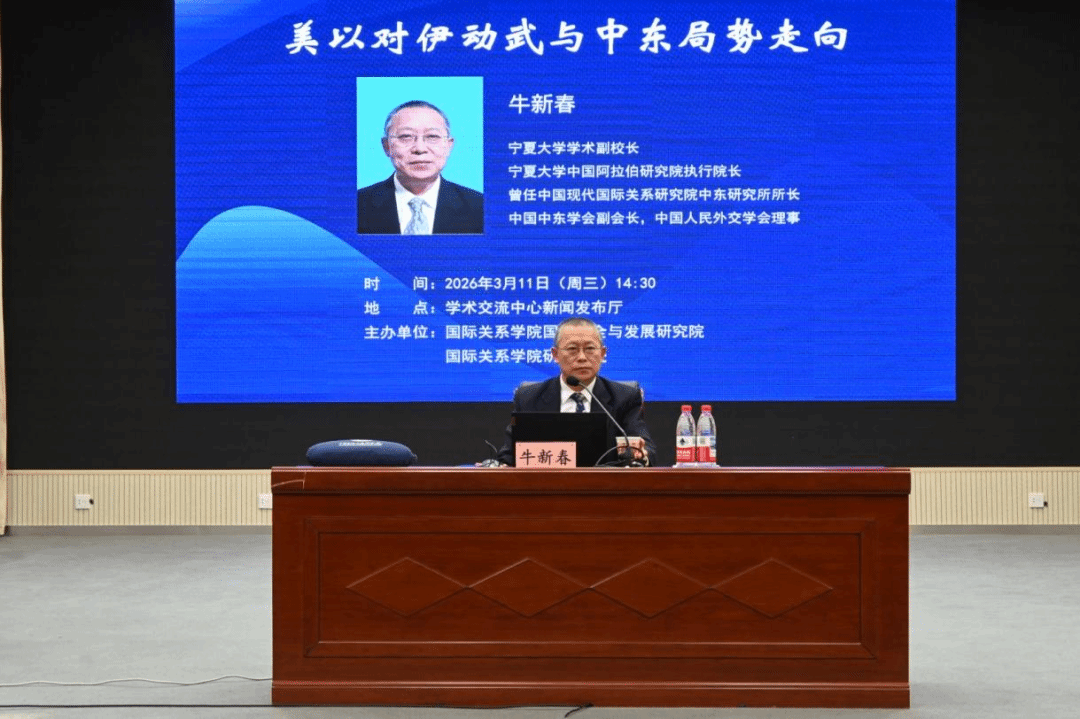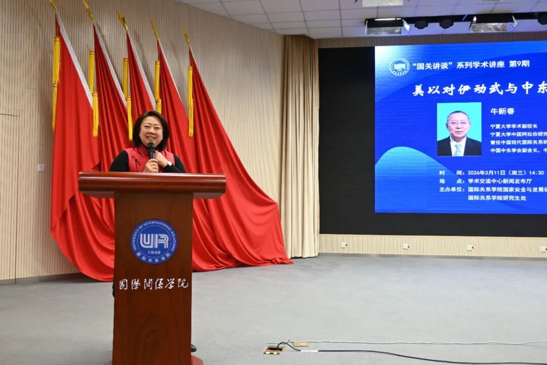 3月11日下午,由国际关系学院国家安全与发展研究院、研究生处共同主办的“国关讲谈”系列学术讲座第9期在学术交流中心第一放映厅顺利举行。本次讲座特邀宁夏大学学术副校长、宁夏大学中国阿拉伯研究院执行院长牛新春来校交流,并围绕“美以对伊动武与中东局势走向”作专题分享。活动由科研管理处副处长李梦欣主持。